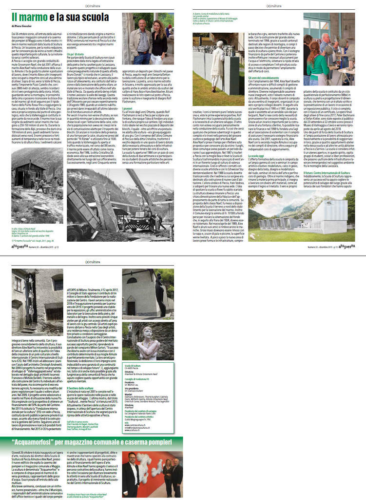 Dal 26 ottobre scorso, all’entrata della sala multiuso presso i magazzini comunali e la caserma dei pompieri di Maggia sono in bella mostra i rilievi in marmo realizzati dalla Scuola di Scultura di Peccia. Un’occasione, per la nostra redazione, per far conoscere più da vicino ai nostri cittadini questo importante polo culturale, la cui notorietà varca i confini vallerani.