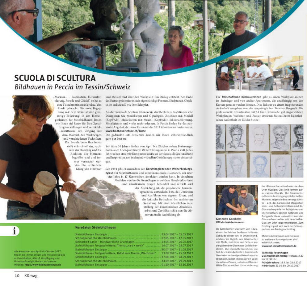 Im KKmag für Kultur Kurse 2017 wurde die Bildhauerschule von Peccia für ein doppelseitiges Portrait ausgewählt.